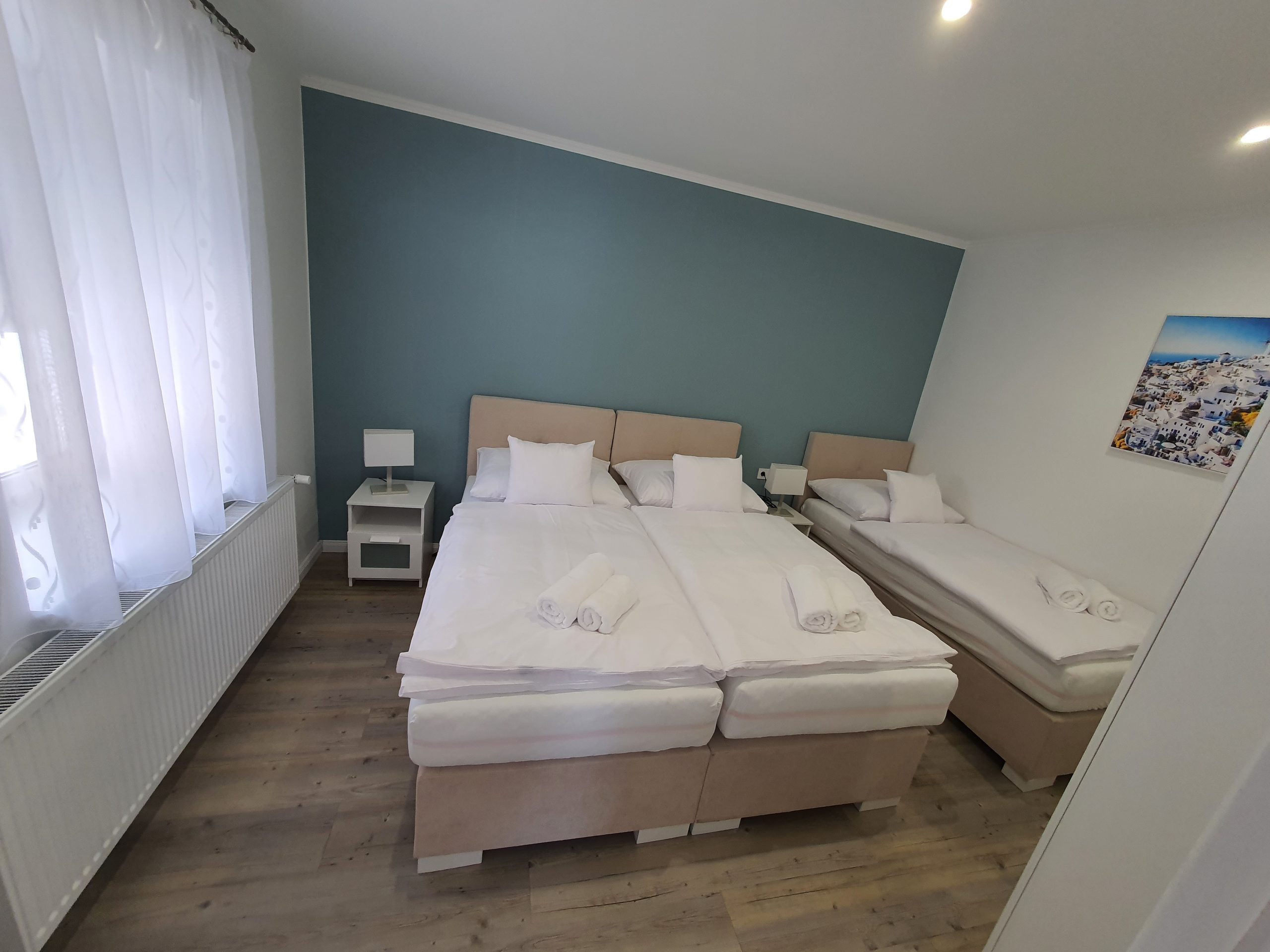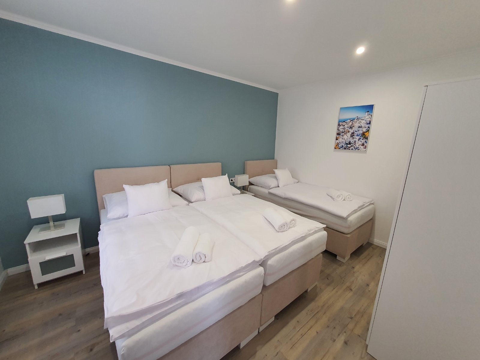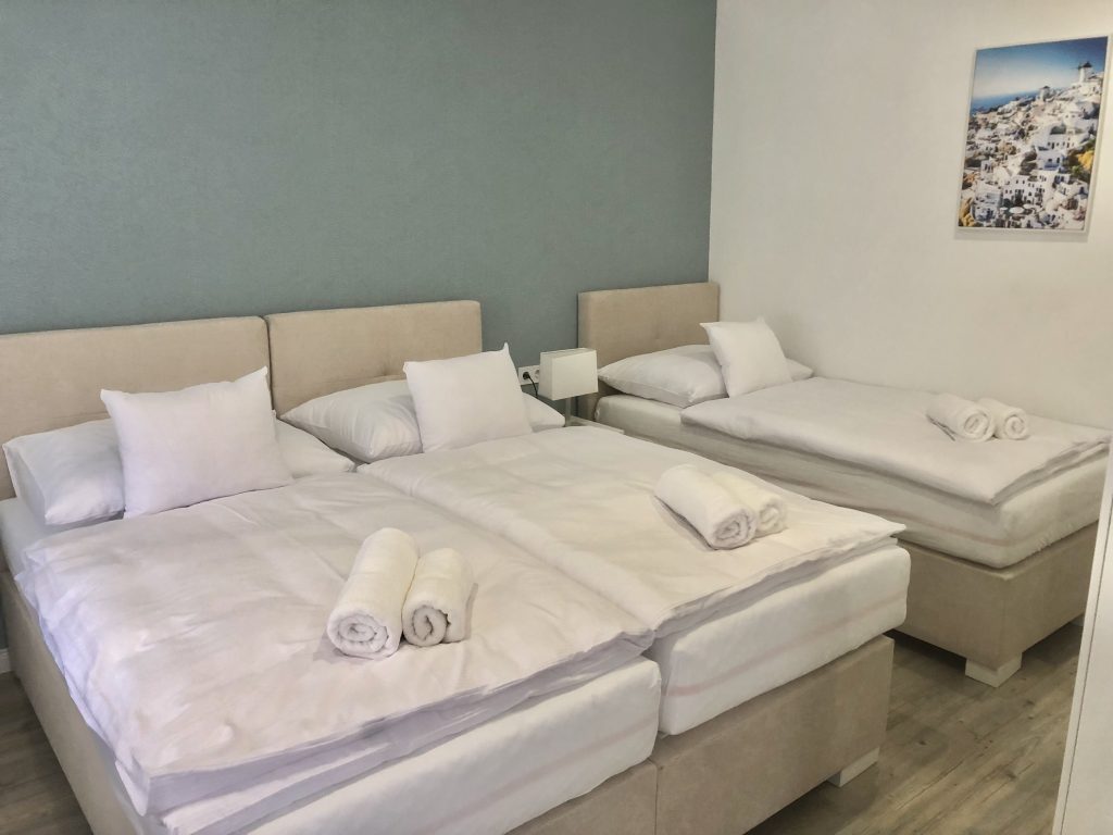 Mykonos 2 je dvosoban porodični apartman, pogodan za 1 do 3 osobe. Unutar apartmana, zasebna spavaća soba ima tri visokokvalitetna Boxspring kreveta za udoban boravak. Dva kreveta mogu da se spoje kako bi formirala bračni krevet, dok je treći zaseban singl krevet.